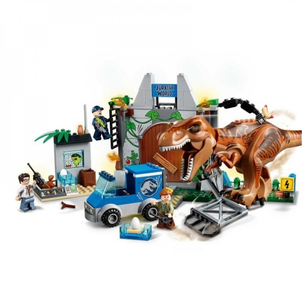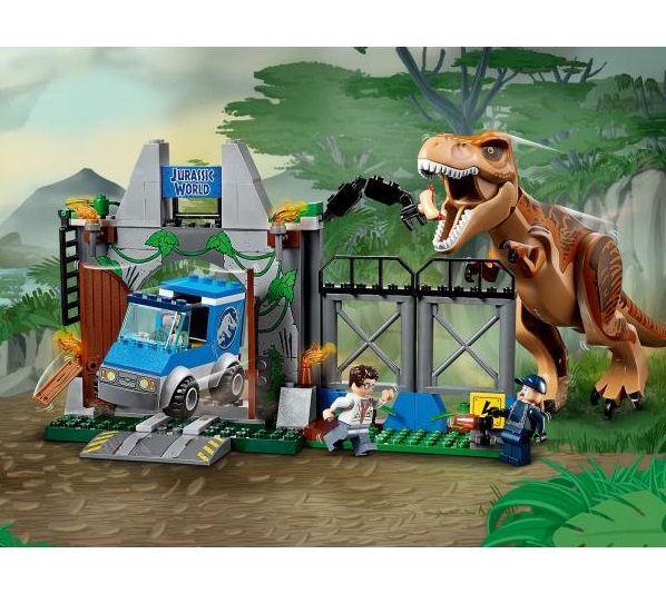 Вольер для Ти-Рекса  (14x22x11 см. Lepin.by.) состоит из двух каркасных секций ограды, которая, о чём сообщает табличка у рычага с краю, находится под высоким электрическим напряжением. Над вольером установлена кормушка: подвижная конструкция с хот-догом на специальном крепеже.